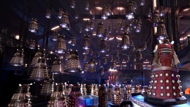 Bypassing zombie hordes and Dalek patrols (along the way discovering that it looks like the Daleks are literally sawing the planet in half), they make it to the secret launch pad. Suddenly, they're in this: